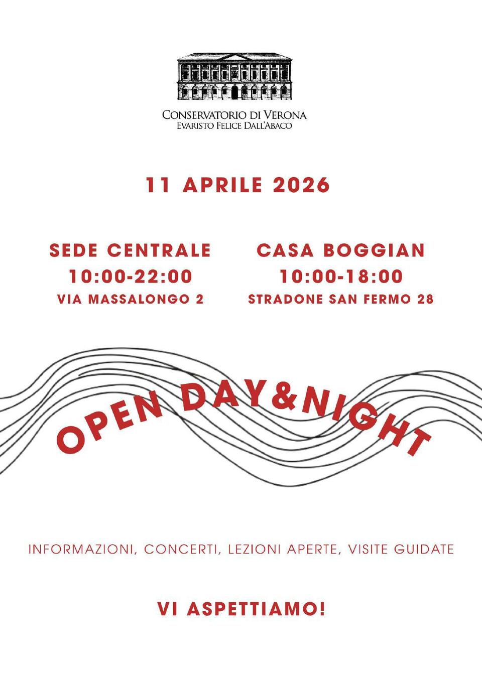 Sabato 11 aprile 2026 nella sede centrale di via Massalongo 2 e nella sede di Casa Boggian in Stradone San Fermo 28 si svolgerà una giornata aperta in cui sarà possibile accedere al Conservatorio per avere informazioni sui percorsi di studio ed ascoltare esecuzioni musicali dal vivo.
