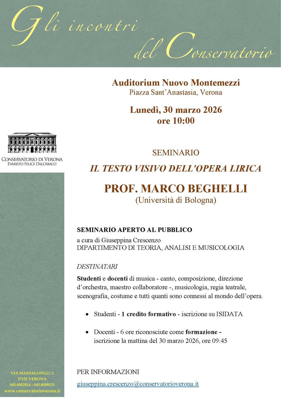Il seminario del Prof. Marco Beghelli (Università di Bologna),“Il testo visivo dell’opera lirica”, si terrà lunedì 30 marzo 2026 presso il Conservatorio di Musica di Verona – Auditorium Nuovo Montemezzi con orario 10.00-16.00 circa.